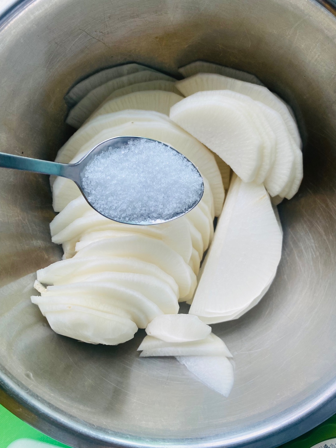 절인무에 설탕 5T, 식초 4T 물이 생겨 싱거워져 소금도 약간 넣었어요