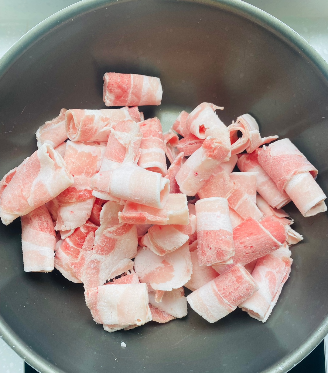 잘익은 대패삼겹살에 양념장을 넣고 물기 없이 바싹 익혀줍니다