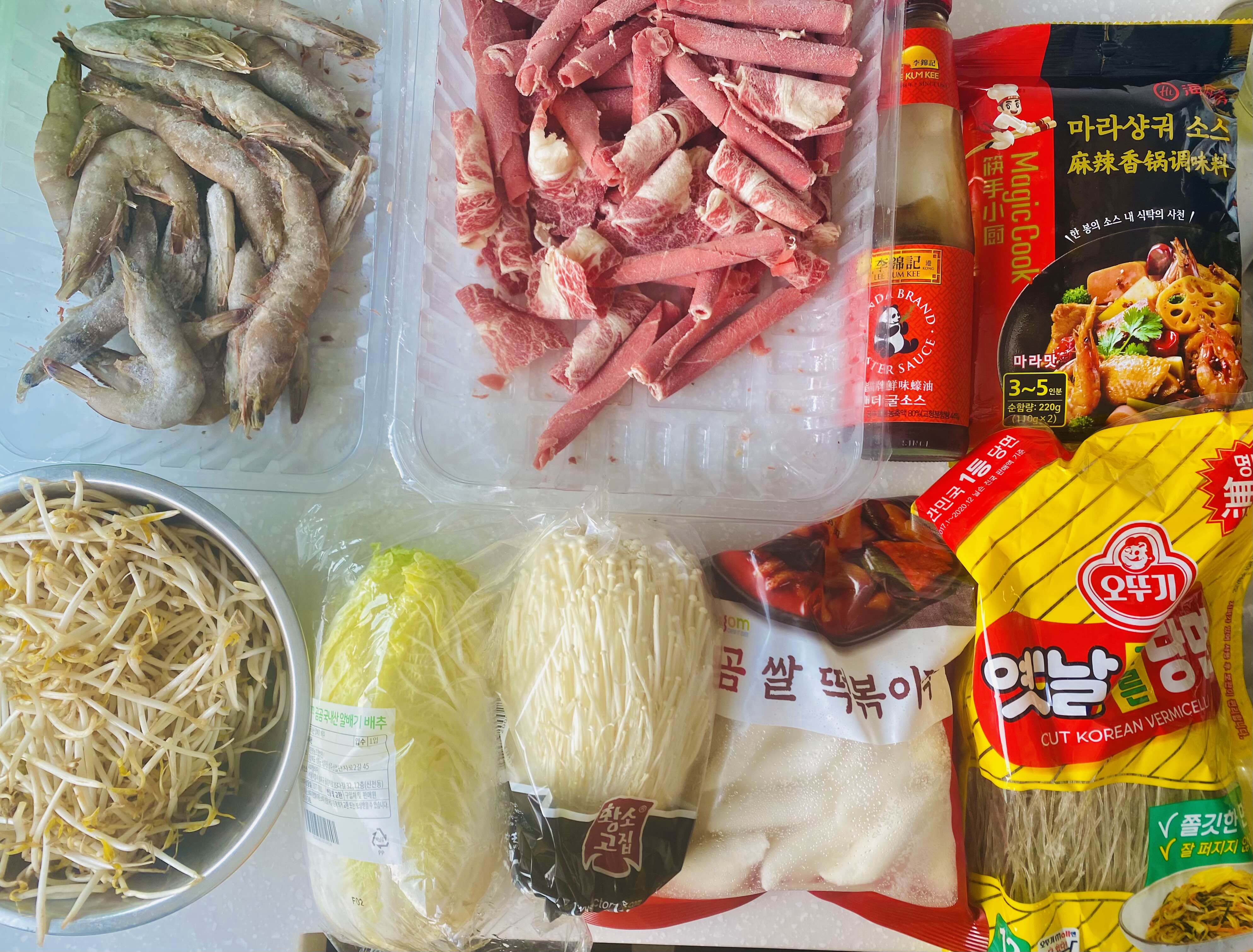 마라샹궈 만들기전 재료들을 모두 꺼냈어요. 냉면같이 실수하지 않기 위해서 마라샹궈 소스 뒤 레시피를 꼼꼼하게 읽어보았어요ㅎ소스는 하이디라오 제품이예요!