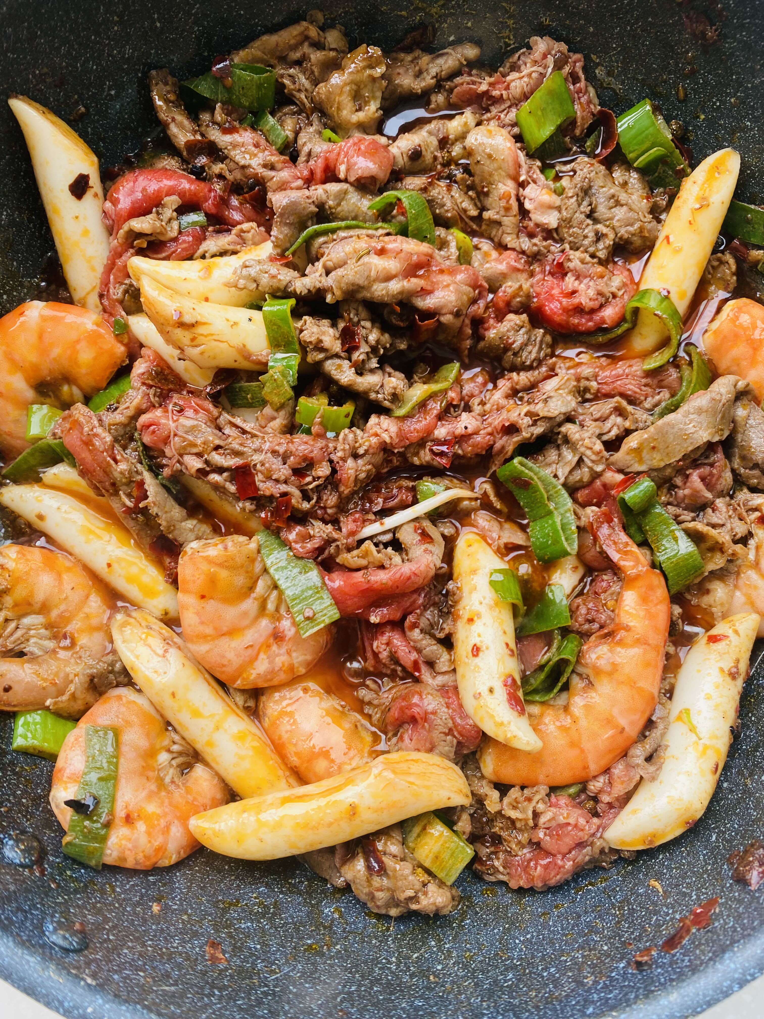소스에 차돌박이와 새우를 넣고 먼저 볶았어요