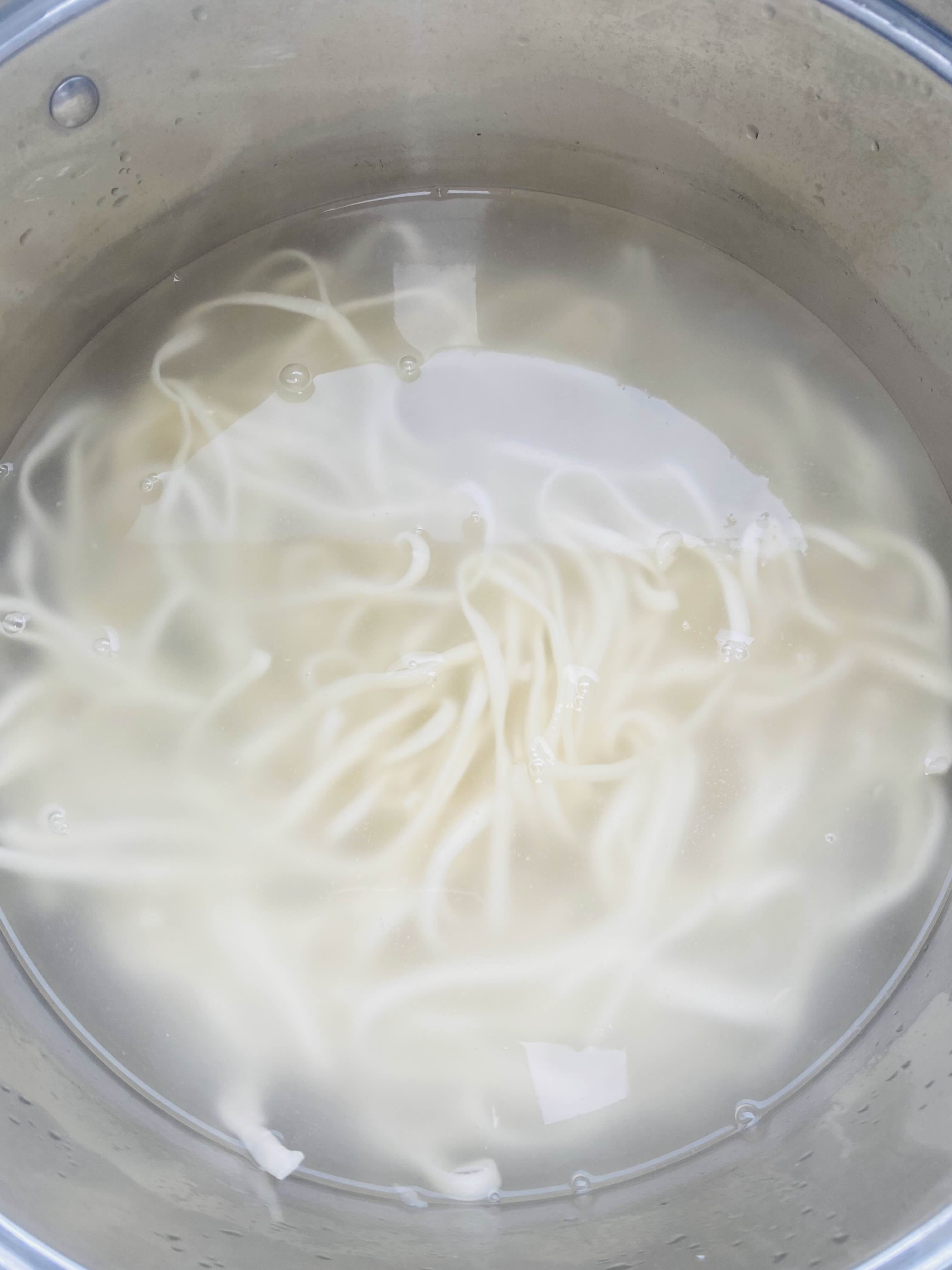 육수에 버섯, 배추, 양파를 썰어넣었어요. 칼국수면은 원래는 만들어서 먹는데 오늘은 시간이 부족해서 시판용으로 했어요. 칼국수면은 끓는물에 끓여서 찬물에 헹궈줘요.