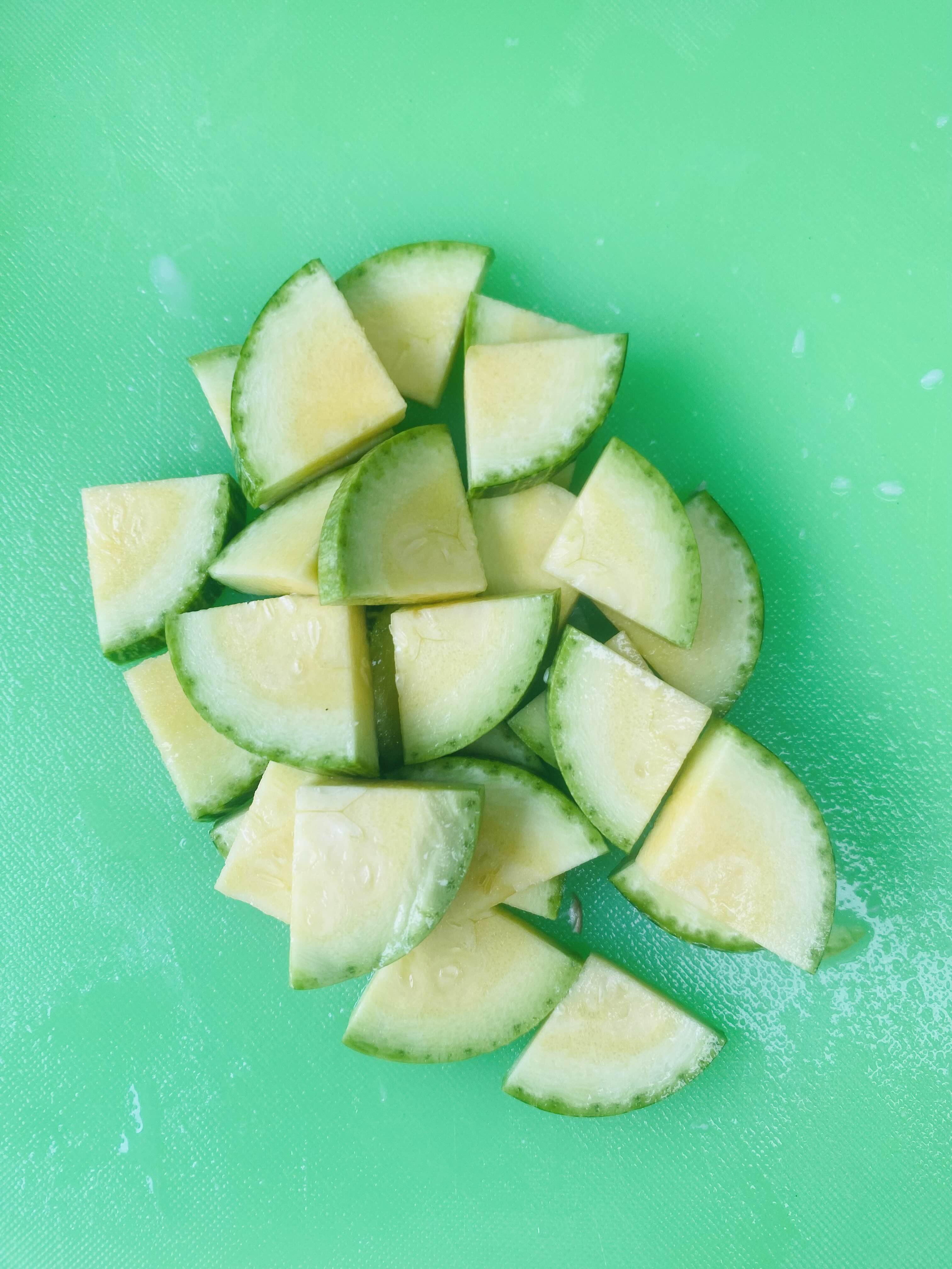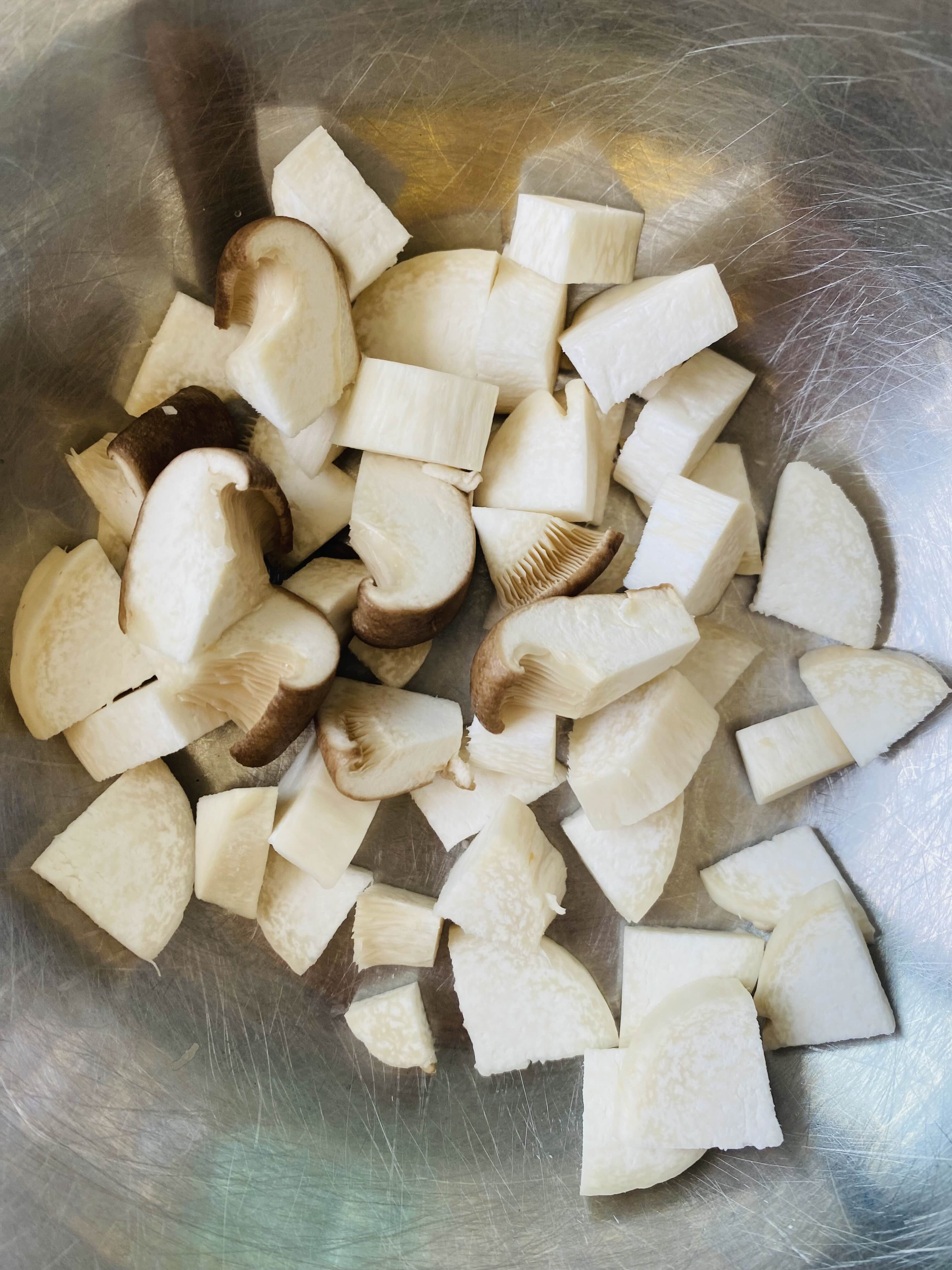 수육을 삶아놓고 된장국을 만들어요. 버섯, 애호박, 양파, 얼갈이배추를 썰어줘요.